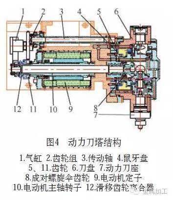 (2)动力刀塔。我公司研制的十二刀位动力刀塔结构如图4所示,装刀方式为星型布置,配BMT65型刀座,刀座刚性好、切削力大、精度高。无论换刀和铣削,驱动动力都来自同一内藏电动机,当刀盘需变换刀位时,在油压的作用下,鼠牙三齿盘松开(鼠牙三齿盘由锁紧齿盘、定位齿盘和转动齿盘组成,每个齿盘均为24齿),气缸推动齿轮12右移,与齿轮组啮合,其齿轮速比为1∶12,经传动轴带动齿轮5转动,而齿轮5与鼠牙三齿盘转动齿盘、刀盘联为一体,即刀盘转动换位指定刀位后,通过鼠牙三齿盘锁紧齿盘的移动实现刀盘的锁紧。当气缸推动齿轮12左移,与齿轮11咬合,齿轮11与电动机转子主轴是一体,电动机的转动通过螺旋伞齿轮以相同的速度带动动力刀座上的刀具转动,对工件进行铣、钻、攻螺纹等的加工。使用室温同调型油冷机,对内置电动机的发热进行冷却。