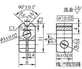 (3)V形块也是成对使用的,材料为淬硬高速钢,V形槽工作面研磨。成对V形块的V形槽与φ3mm孔等高≤0.01mm,其他尺寸如图4所示。不过有时要检测的工件2处外圆基准不等径时,V形槽与φ3mm孔的距离尺寸不等高就要专门设计。