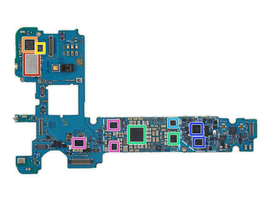 红色:三星K3RG2G20CMMGCJ4GBLPDDR4SDRAM内存,下方覆盖着高通骁龙820处理器。