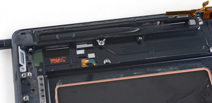 Note7上的散热管很纤薄。散热管旁边是SPen的插槽管,其插槽管被各种粘合物固定着,在插槽管的底部有一个灰色的橡胶块,这是用来保护SPen的笔尖的。