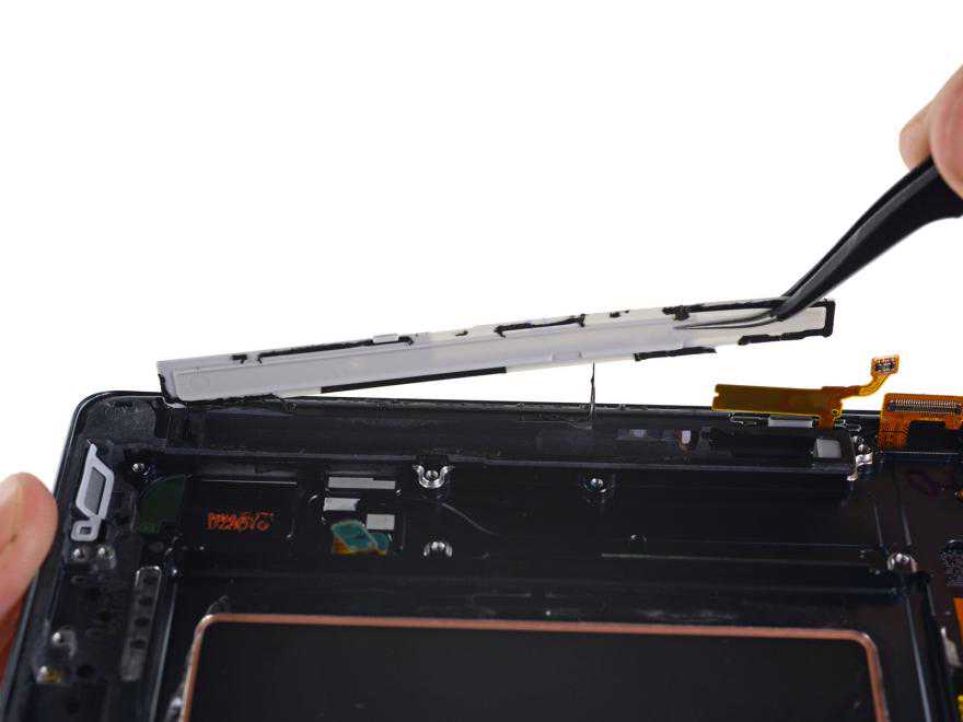 拆下无线电圈后,可以看到Note7的电池,将拨片插入电池底部,再用撬棒就可将其从主板上拆卸下来,不过这有点费力。我们还能够看到内置天线的单扬声器,扬声器周围有一层垫圈和网衬,这应该是为了防水而设计。电池容量为3500毫安时。