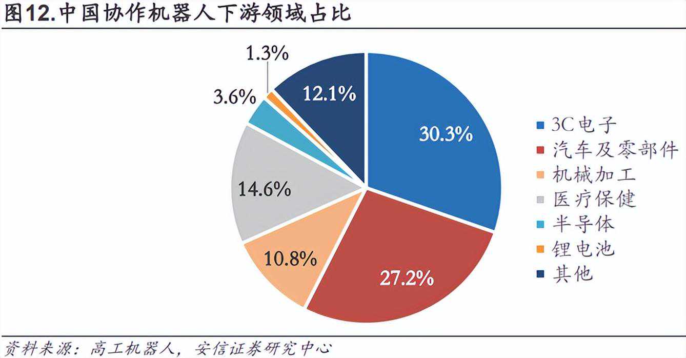 协作机器人工作精度要求高,多维力传感器赋能提升精细化程度。3C电子为协作机器人第一大下游应用领域,约占总市场规模的30.3%;其次,协作机器人在汽车及零部件、机械加工、医疗保健、半导体、锂电池等领域也有着广泛应用,分别占总市场规模的27.2%,10.8%、14.6%、3.6,1.3%。