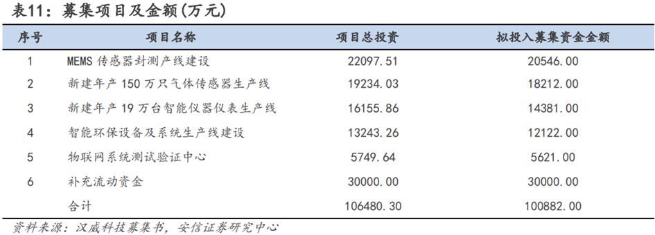 募集资金6亿新建产业线,持续提高传感器核心竞争力。2020年8月公司拟向特定对象发行股票10亿元,主要用于“MEMS传感器封测产线建设”,“新建年产150万只气体传感器生产线”,“新建年产19万台智能仪器仪表生产线”,“智能环保设备及系统生产线建设”,“物联网系统测试验证中心建设”等。其中,智能环保设备及系统生产线建设完成后,公司将新增3000台智能环保设备;MEMS传感器封测产线建成达产后,预计新增3820万支MEMS传感器产能。2021年8月,公司完成定增募资,实际募集资金6亿元,MEMS传感器封测产线建设项目预计2024年末建成,新建年产150万只气体传感器生产线预计2024年Q3末建成。项目预计在T3年达产率为50%,T4年达产率为70%,从T5年开始产能达到100%。