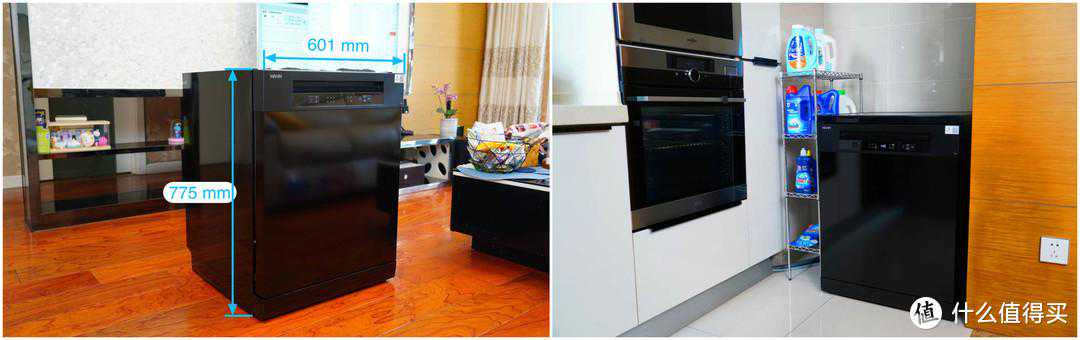 ▲这款洗碗机总高775mm,非常适合中式厨房的嵌入安装。正面是一块黑晶钢化玻璃。外观上非常大气。
