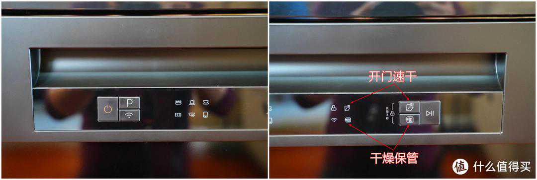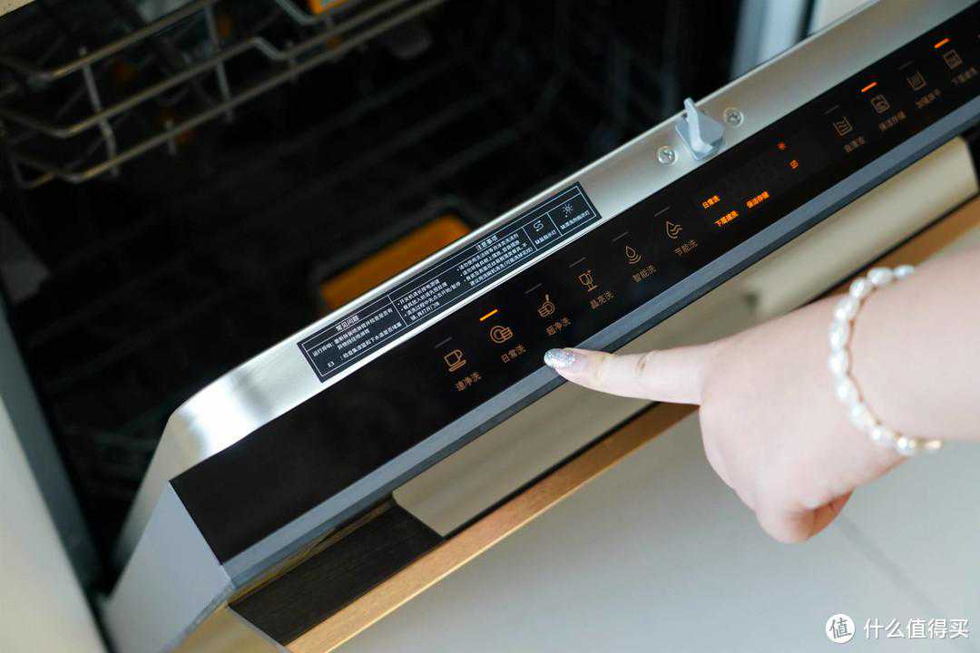 ▲洗碗机操作界面位于舱门上,不用弯腰就能进行相关操作,符合人体工程学。共设计了10个功能按键,8种模式可选。