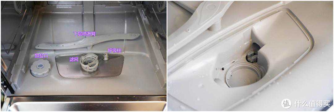 ▲有专门的软化盐和亮碟剂加注口,餐具洗完不会有水痕存在。