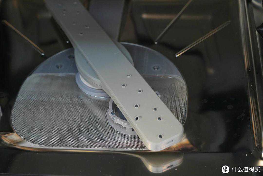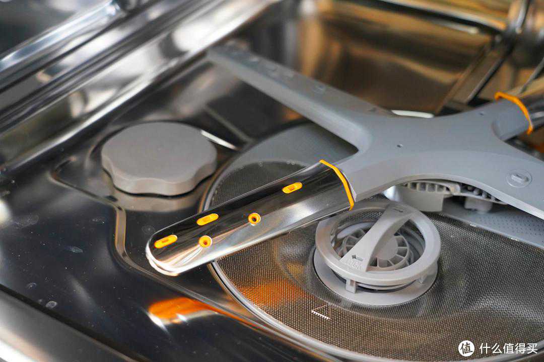 ▲喷水摇臂喷口特写:相比传统洗碗机,它的喷射水流角度更多。水从中心喷入后通过负压吸入空气并和水混合,喷出带水+气泡的水流形成脉冲式冲击。