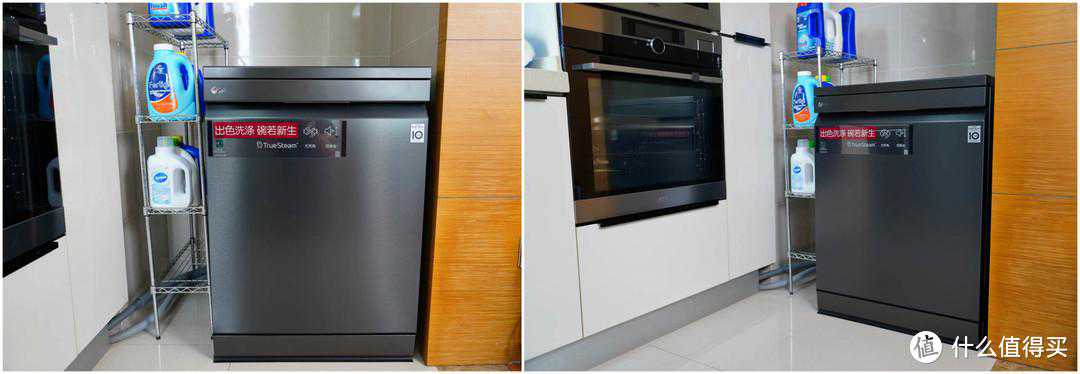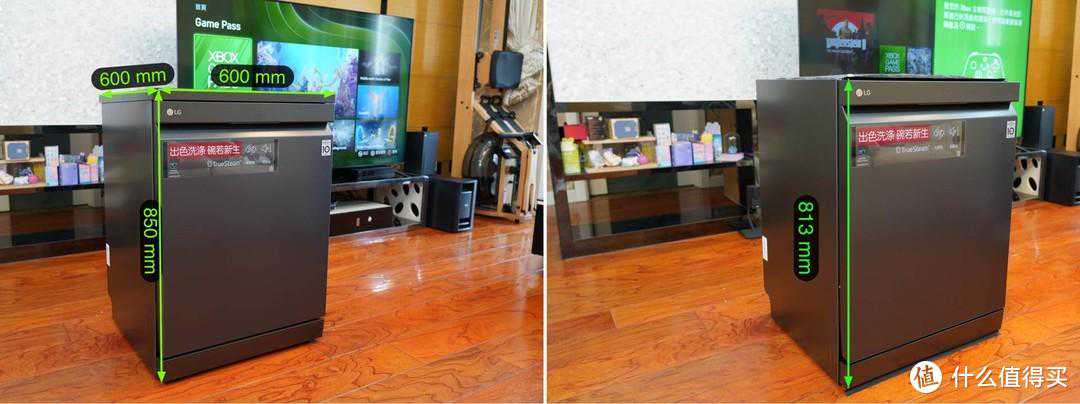 ▲这款LG14套洗碗机为独立嵌入式两用洗碗机。当独立式使用时高850mm,嵌入式安装掀除顶盖后高度降为813mm。所以嵌入安装肯定需要装修时就考虑到位。