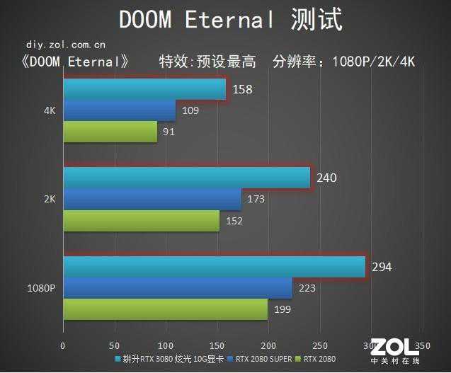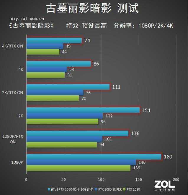 在1080P分辨率下,耕升GeForceRTX3080炫光10G显卡比RTX2080分数高57%,2K分辨率下高94%,4K分辨率下高100%。
