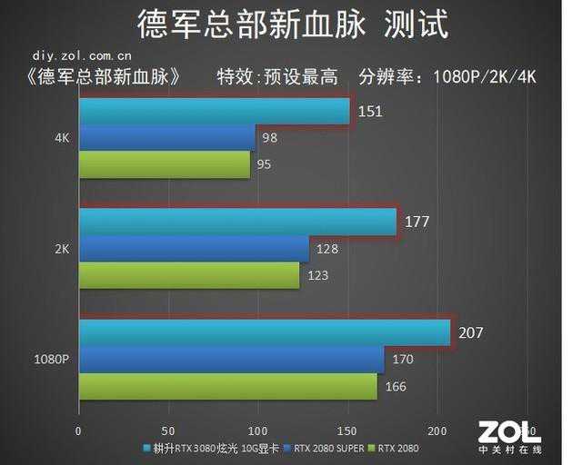 《德军总部新血脉》:其中耕升GeForceRTX3080炫光10G显卡比RTX2080在1080P分辨率下的分数高25%,2K分辨率下高43%;4K分辨率下高59%。