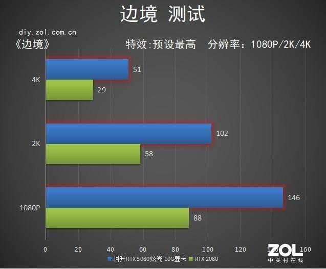 其中耕升GeForceRTX3080炫光10G显卡比RTX2080在1080P分辨率下高48%;2K分辨率下高58%;4K分辨率下高74%。这款游戏由于并没有Benchmark,所以测试会存在一定的误差,该帧数仅供参考。