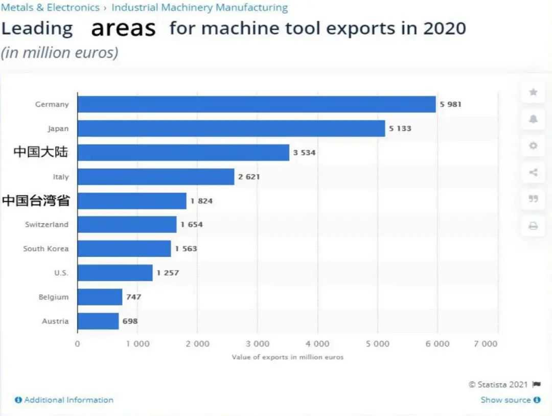 2020年,智研咨询发布的《2021-2027年中国机床行业市场运营态势及未来发展潜力报告》显示,台湾地区机床以30.7亿美元的出口额位列全球第五,紧跟在德国(91.9亿美元)、日本(79.4亿美元)、中国大陆(44.2亿美元)和意大利(44.2亿美元)之后。
