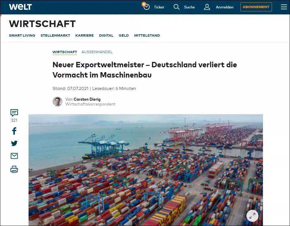 今年年中,德国《世界报》忧心忡忡地发布一则深入报道,德国机械设备制造业联合会(VDMA)最新的研究指出,2020年,中国以1650亿欧元的出口额首次超越德国,成为全球机械设备的出口冠军。
