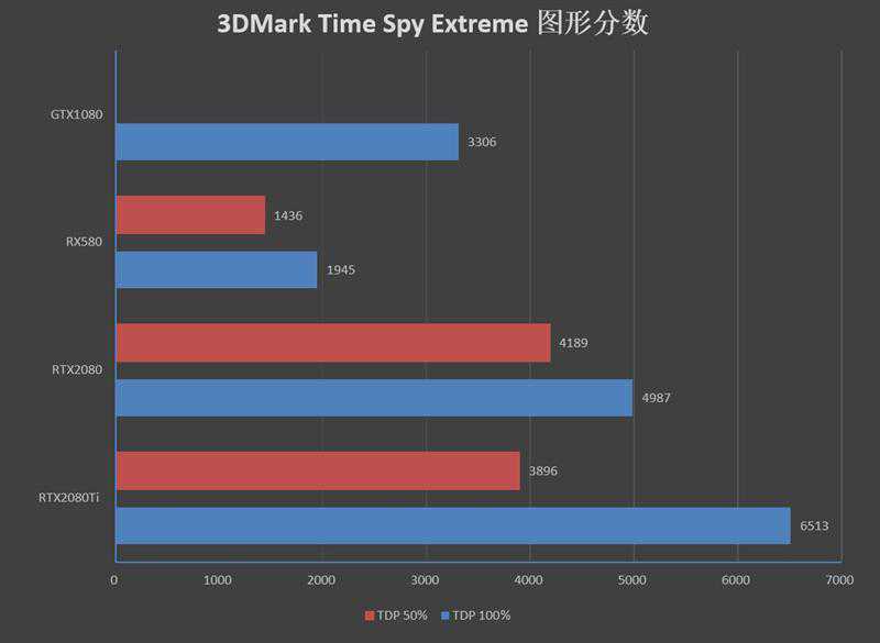 在3DMarkTimeSpyExtreme测试中,50%TDP时RTX2080成绩反超了RTX2080Ti,并且相比GTX1080能有25%的领先优势。