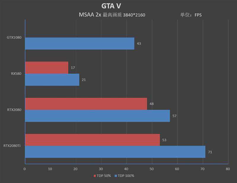 在《GTAV》中,RTX2080帧率为48FPS,相比100%TDP时损失了9帧,RTX2080Ti帧率为53FPS,损失了18帧。