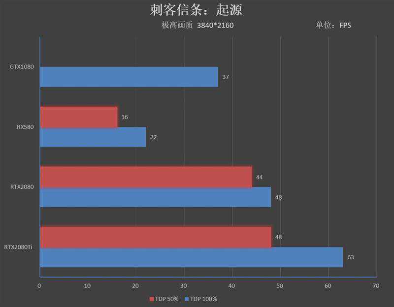 在《刺客信条:起源》中,RTX2080帧率为44FPS,相比100%TDP时仅仅只损失了4帧,RTX2080Ti帧率为48FPS,损失了15帧。