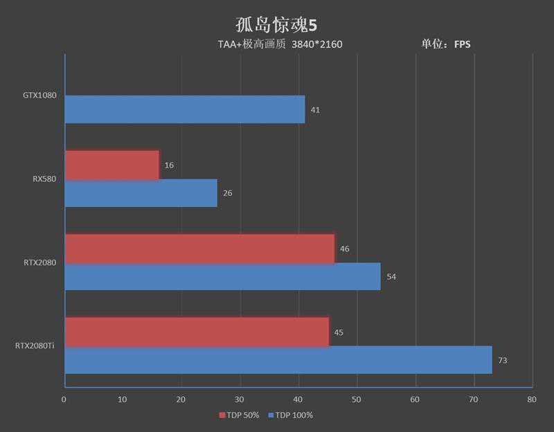 在《孤岛惊魂5》中,RTX2080帧率为46FPS,相比100%TDP时损失了8帧,RTX2080Ti帧率为5FPS,大幅损失了28帧。