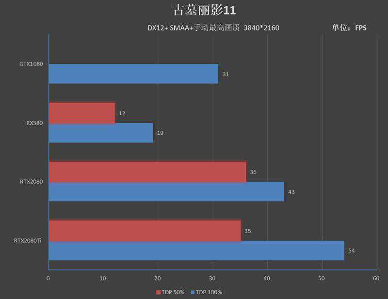 在《古墓丽影11》中,RTX2080帧率为36FPS,相比100%TDP时损失了7帧,RTX2080Ti帧率为35FPS,损失了19帧。