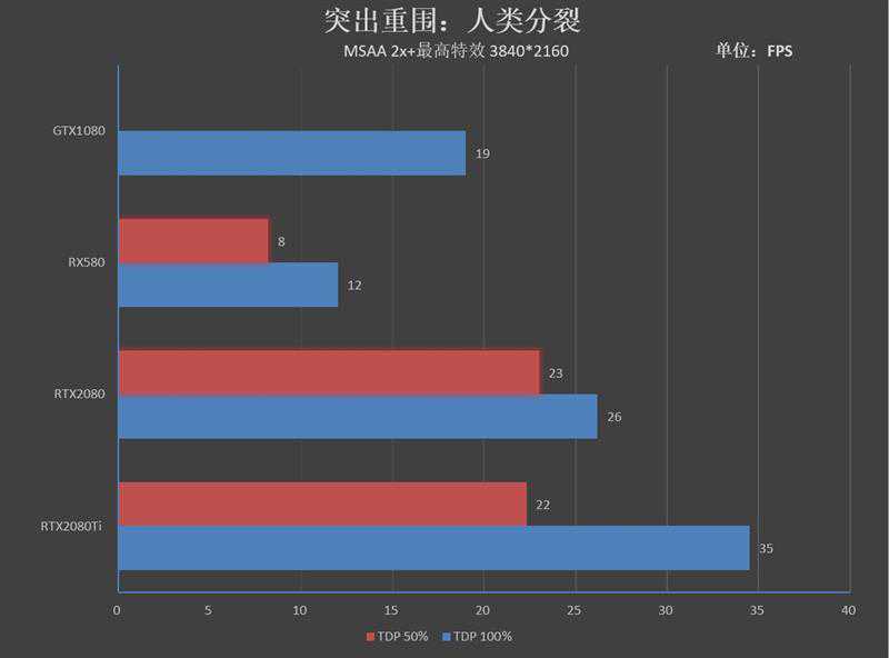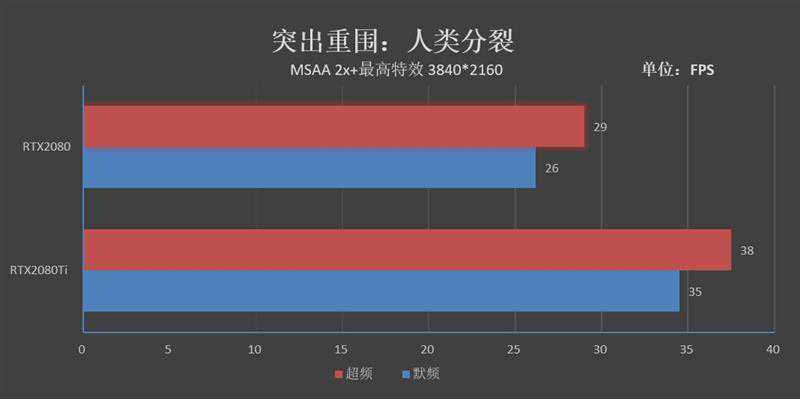 在《突出重围:人类分裂》的测试中,RTX2080的帧率达到了29FPS,比默频提高了3帧;RTX2080Ti的帧率则为38FPS,相比默频提高了3帧。