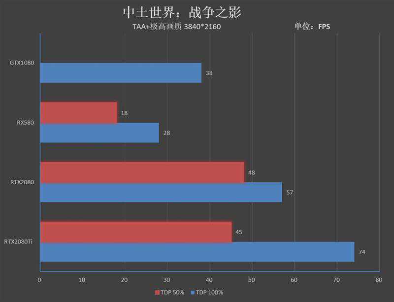 在《中土世界:战争之影》中,RTX2080帧率为48FPS,相比100%TDP时损失了9帧,RTX2080Ti帧率为45FPS,损失了29帧。