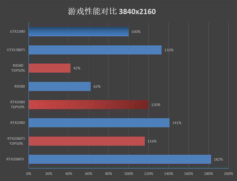 图灵构架拥有非常优秀的能耗比,我们将NVIDIARTX2080/Ti分别降频50%来测试他们的性能表现,借此来模拟未来图灵移动显卡的性能。作为对比,AMDRX580也加入战团。
