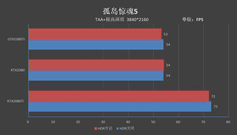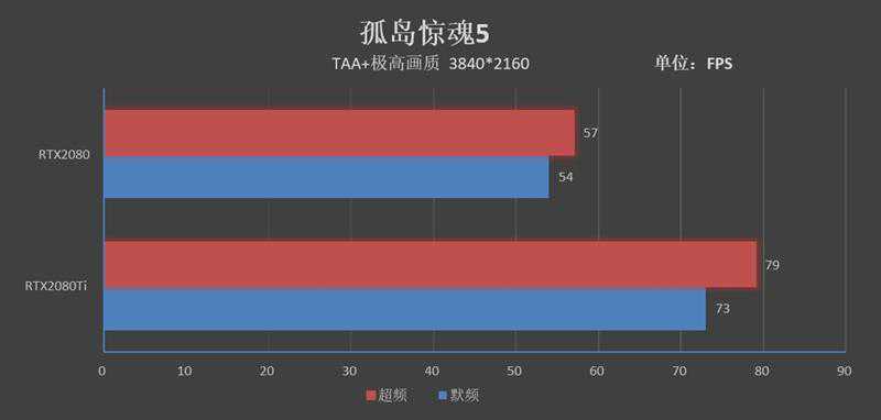 在《孤岛惊魂5》的测试中,RTX2080的帧率达到了57FPS,比默频提高了3帧;RTX2080Ti的帧率达到了79FPS,相比默频提高了6帧。