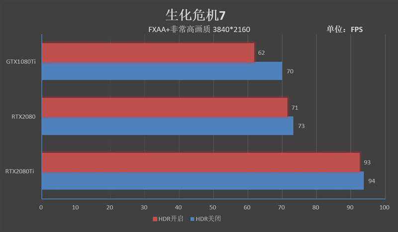 在《生化危机7》中,打开HDR之后,GTX1080Ti损失了8帧,二款图灵显卡的帧率只有1~2FPS的损失。