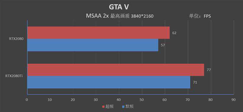在《GTAV》的测试中,RTX2080的帧率达到了62FPS,比默频提高了5帧;RTX2080Ti的帧率也达到了77FPS,相比默频提高了6帧。