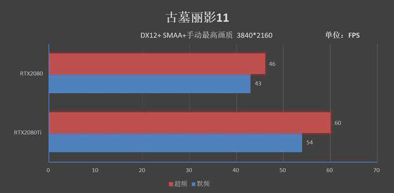 在《古墓丽影:暗影》的测试中,RTX2080的帧率达到了46FPS,比默频提高了3帧;RTX2080Ti的帧率也达到了60FPS,相比默频提高了6帧。
