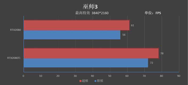 在《巫师3》的测试中,RTX2080的帧率达到了61FPS,比默频提高了5帧;RTX2080Ti的帧率则为78FPS,相比默频提高了6帧。