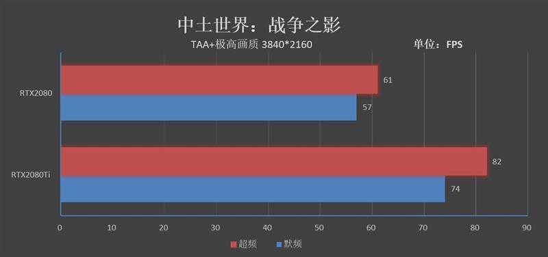 在《中土世界:战争之影》的测试中,RTX2080的帧率达到了61FPS,比默频提高了4帧;RTX2080Ti的帧率也达到了82FPS,相比默频提高了8帧。