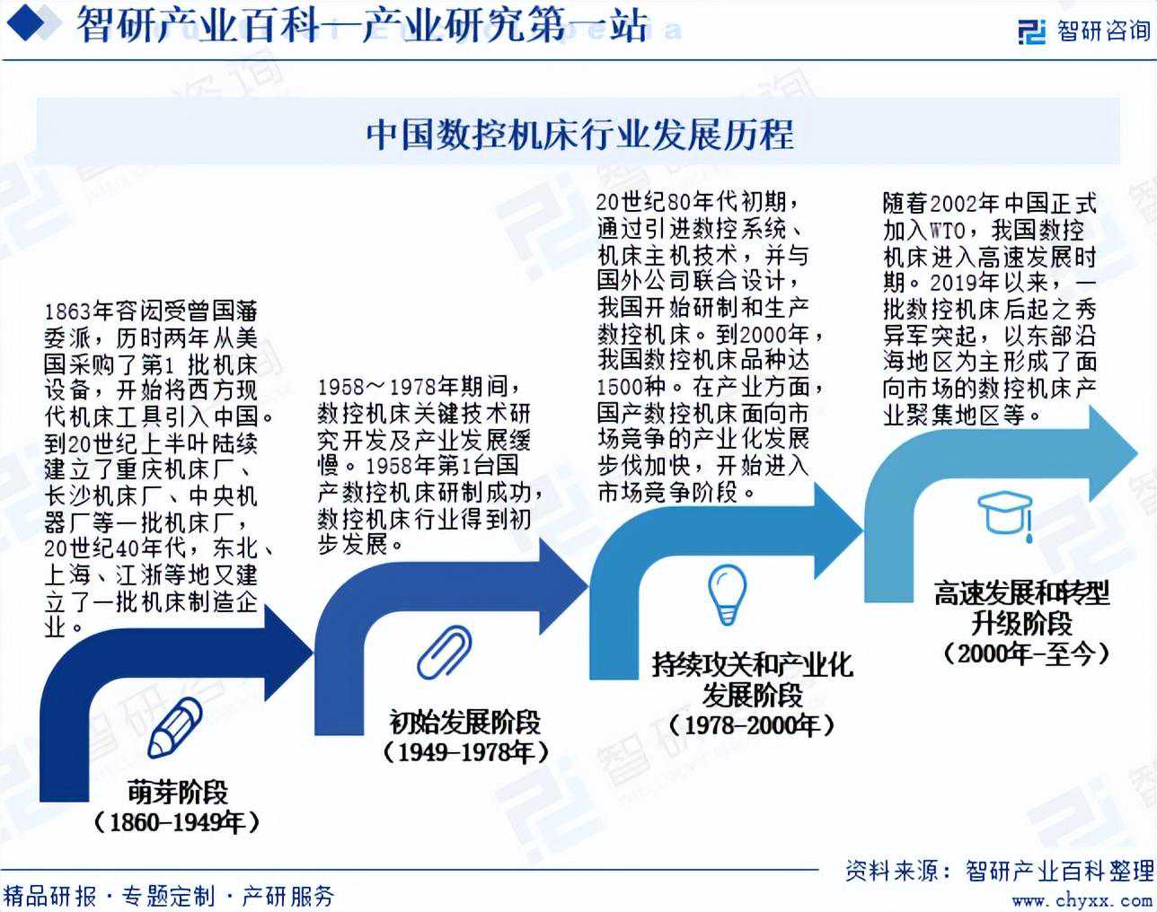 我国数控机床行业起步较早,经过了1949年前的萌芽阶段后,在“一五”期间奠基并快速发展。数控机床的发展历程可分为:萌芽阶段、初始发展阶段、持续攻关和产业化发展阶段、高速发展和转型升级阶段。从1958年到1978年改革开放前,数控机床关键技术研究开发及产业发展缓慢。1958年第一台国产数控机床研制成功,数控机床行业得到初步发展。20世纪80年代初期,通过引进数控系统、机床主机技术,并与国外公司联合设计,我国开始研制和生产数控机床。到2000年,我国数控机床品种达1500种。在产业方面,国产数控机床面向市场竞争的产业化发展步伐加快,开始进入市场竞争阶段。随着2002年中国正式加入WTO,我国数控机床进入高速发展时期。与此同时,2019年以来,一批数控机床后起之秀异军突起,以东部沿海地区为主形成了面向市场的数控机床产业聚集地区等。
