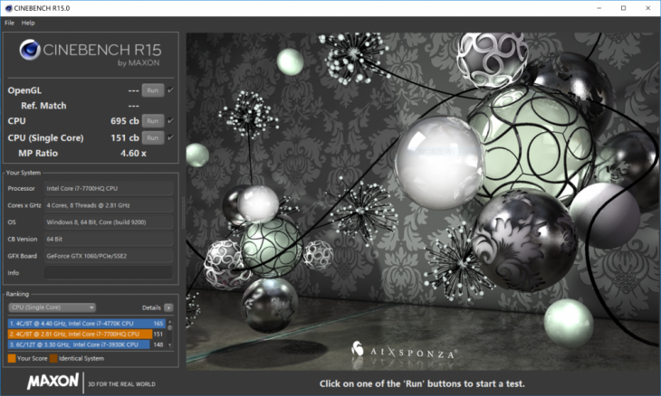 F117-S搭载了全新的第七代酷睿i7-7700HQ处理器,拥有四核心八线程,默认频率2.8GHz,最高睿频达到3.8GHz。我们通过CinebenchR15进行了测试。