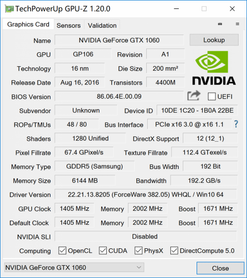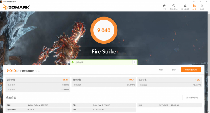 F117-S搭载了基于帕斯卡架构的GTX1060显卡,拥有1280个CUDA核心,8GB的GDDR5显存,核心最高频率高达1671MHz。我们使用权威3D性能测试软件3DMark进行测试。