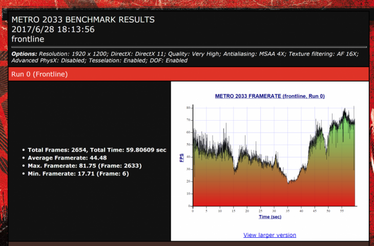 而在压力更大的高画质大作《地铁2033》中,开启1080P最高画质,强大的GTX1060依旧保证了44.48FPS的高帧率,这意味着这款游戏本讲可以运行市面上绝大多数高画质单机大作