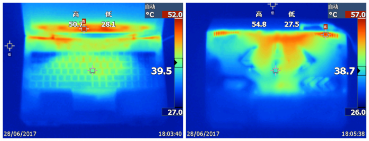可以看到,热量主要集中在出风口以及转轴处,最高温度虽然高达50摄氏度,但键盘表面和掌托部分温度不高,基本上对日常使用不会造成明显影响,对于一款搭载了i7-7700HQ处理器和GTX1060显卡的而且只有23.5mm厚度的游戏本来说,这样的散热水平相当理想。