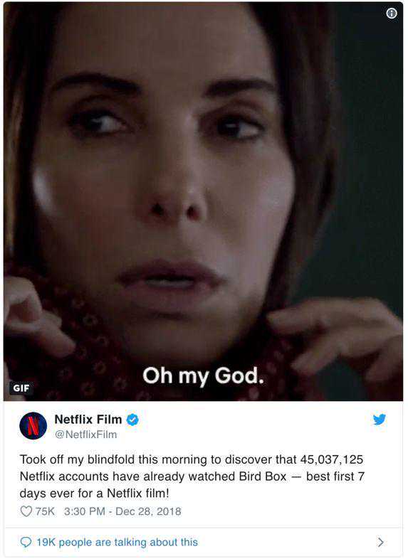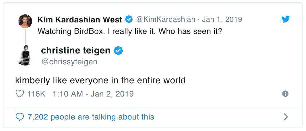 拥有6000万Twitter粉丝的社交名媛金·卡戴珊,就为我们亲身示范了一场。2019年第一天,她发了一条关于Netflix新上的惊悚片BirdBox《蒙上你的眼》的动态,问谁也在看,收到了来自社交达人好友ChrissyTeigen的回复:天呐全世界都在看这片儿。