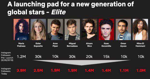 这张图表展示了:Netflix的西班牙原创剧Elite《名校风暴》里8名主演是如何在发片的3个多月内迅速增长了一波Instagram粉丝。其中的7名演员最开始只有1-3万粉丝,而现在已经涨到了100万。
