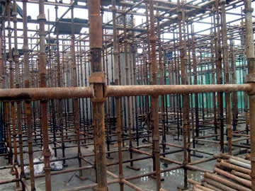⑴底层地面应夯实,底层和楼层立柱应垫通长脚手板,多层支架时,上下层支柱应在同一竖向中心线上。