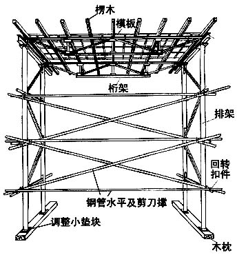 ⑵梁底板下用顶撑(琵琶撑)支设,顶撑间距视梁的断面大小而定,一般0.8~1.2m,顶撑之间应设水平拉杆和剪刀撑,使之互相拉撑成为一整体,当梁底距地面高度大于6m时,应搭设排架或满堂红脚手架支撑;为确保顶撑支设的坚实,应在夯实的地面上设置垫板和楔子。