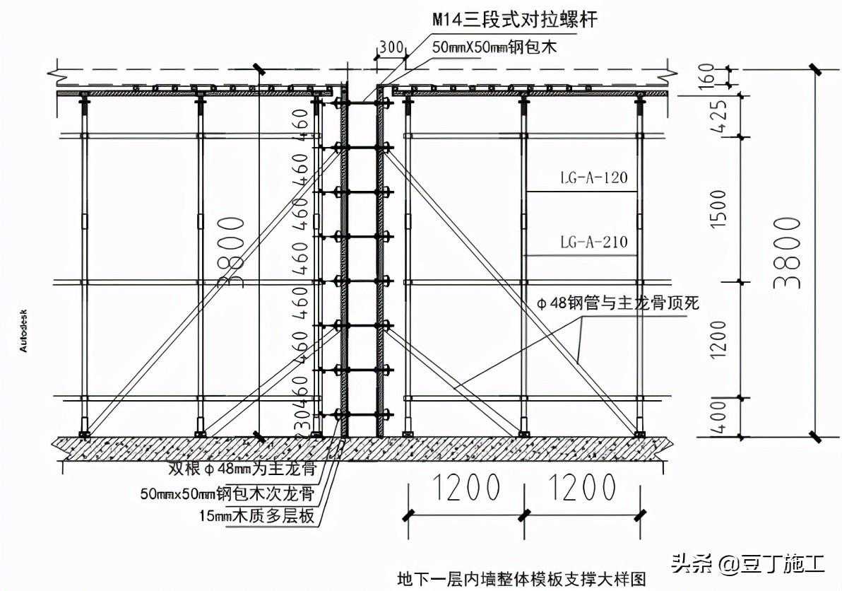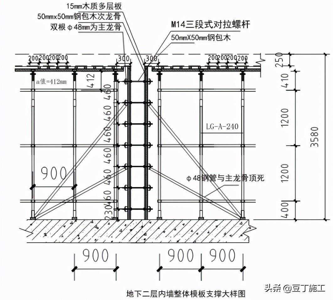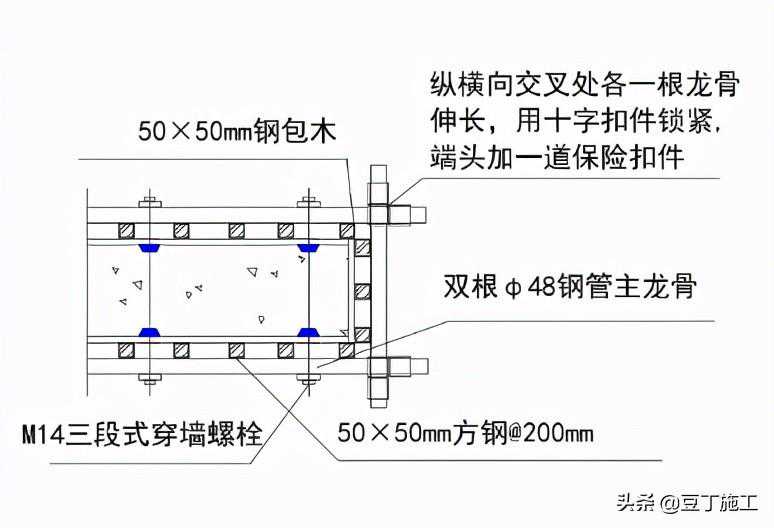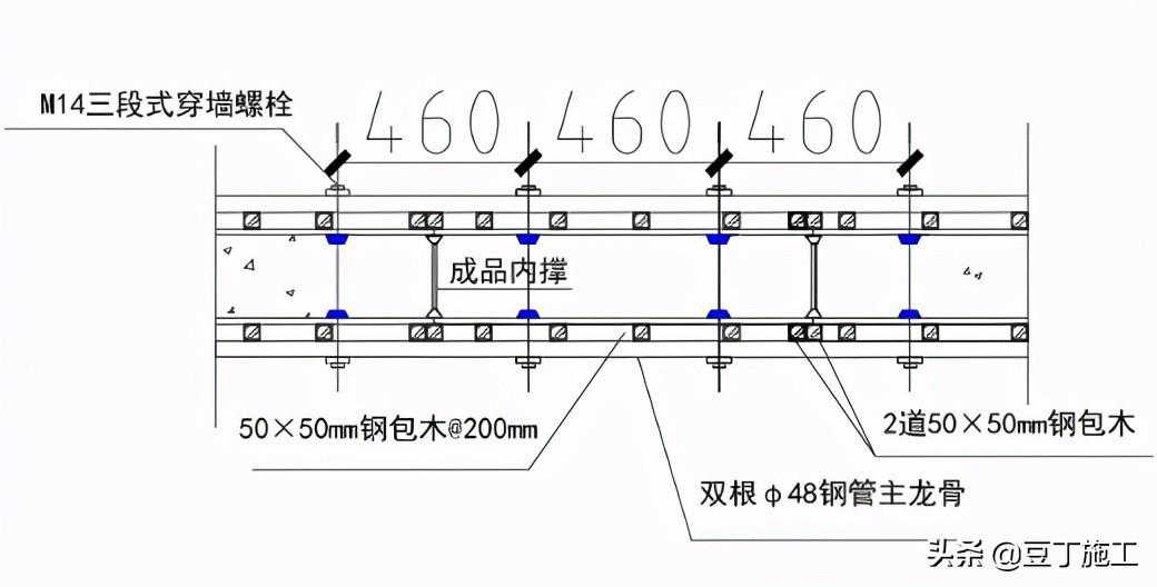 4)对拉螺杆:地下室外墙、水池墙采用三段式对拉止水螺杆,止水铁片70*70*3厚。内墙采用M14三段式对拉普通螺栓,竖向间距同主楞,水平间距≦460mm.位置位于双钢管之间。