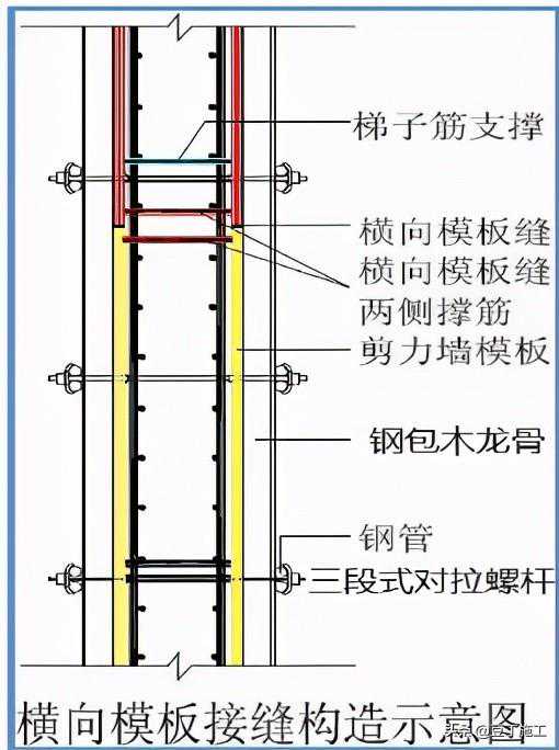 由于部分楼梯梁及楼梯平台板钢筋生根于剪力墙上,而剪力墙应预留接茬口。梯板模板支撑立杆纵距横间距不大于1200mm,水平杆与梯段板平行设置,设置间距与结构板相同。休息平台水平拉杆应满足能通则通与梯板立杆拉结牢固。