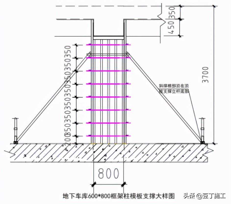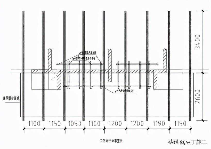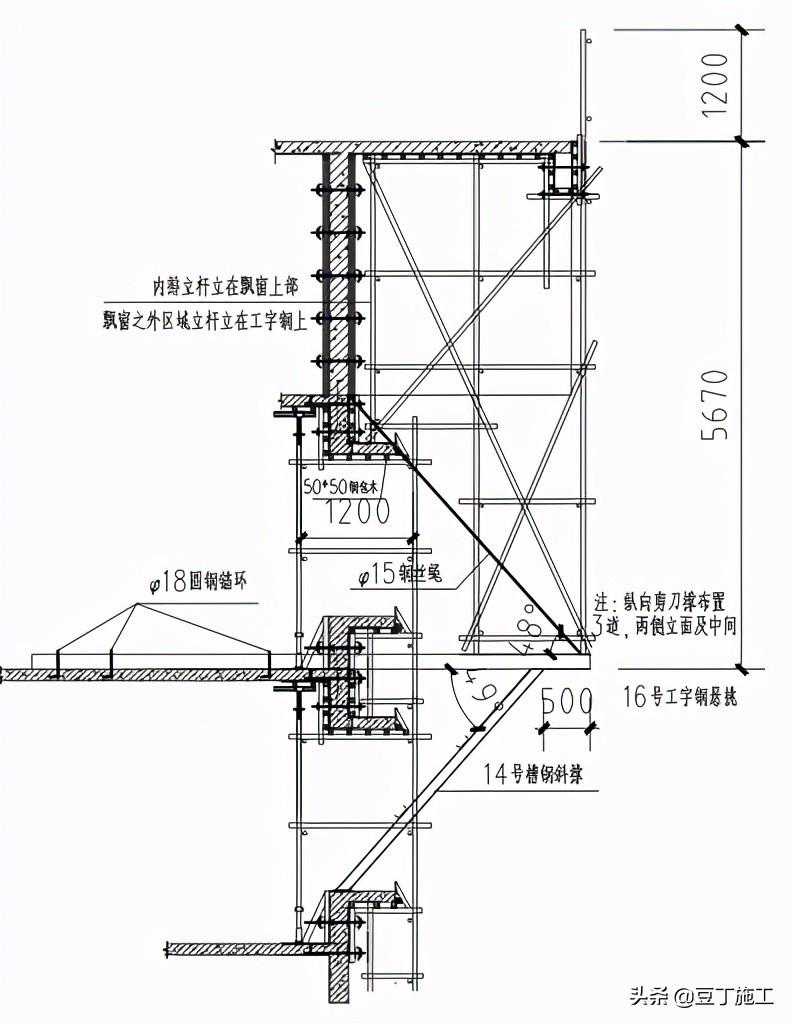 飘窗支撑立杆间距600mm,室内立杆可利用顶板支撑立杆,不足的部位采用附加立杆;室外立杆从室外地坪或车库顶板搭起,外立面设剪刀撑;三层以上飘窗外立杆采用从下层飘窗板附加斜撑杆方式支撑。
