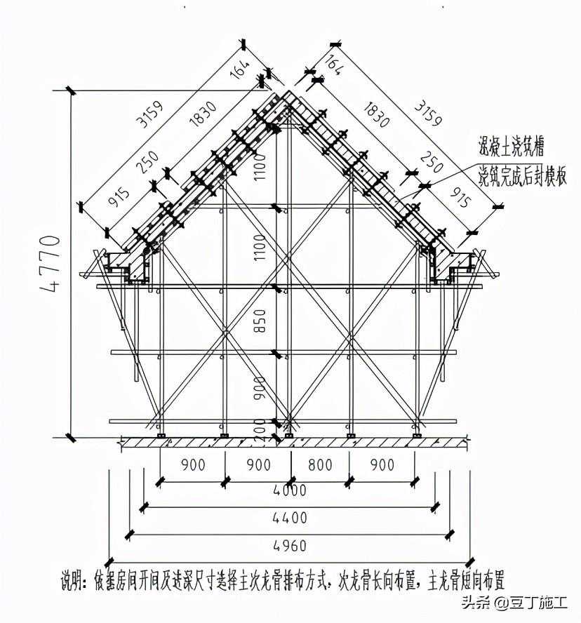 对于天沟等悬挑部位采用斜撑脚手架支设。并与顶板支撑架连成整体。