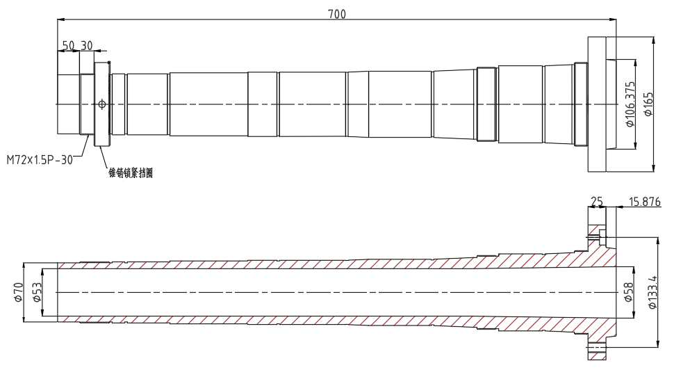 由于主轴孔径为Ø53,最终确定拉杆外径设计为Ø50,内径Ø40,见下图: