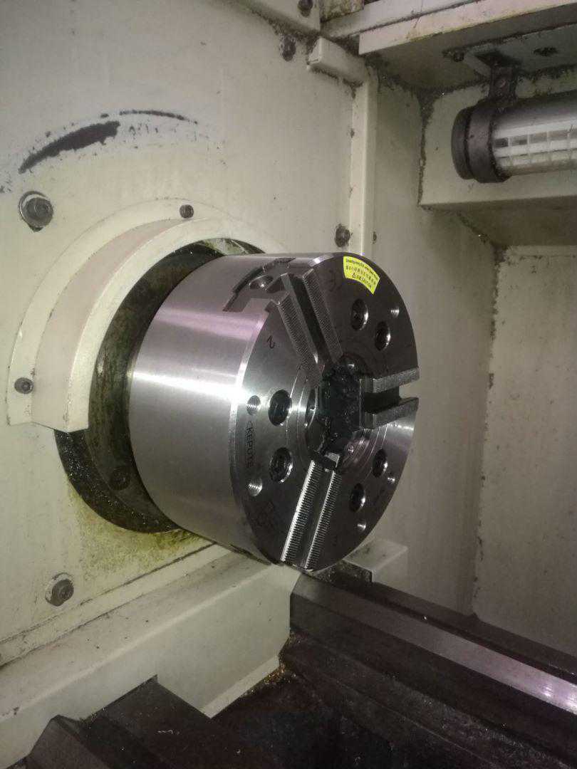 拆除卡盘上的卡爪,用吊具吊起卡盘,移动到主轴端,当卡盘定位孔与主轴定位销对齐,螺母与拉杆对齐后,用专用扳手旋转卡盘螺母旋入拉杆,使卡盘向主轴端慢慢贴紧,完全贴紧后安装6颗M12×100高强度螺栓连接紧固;