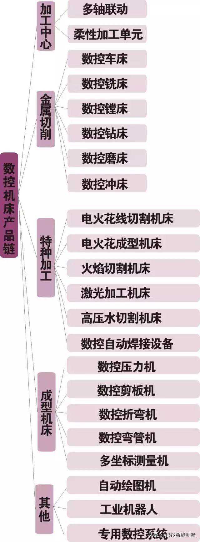 数控机床产品链相对其他几个环节要长一些,总体来讲包含加工中心、金属切削、特种加工、成型加工和其他部分。