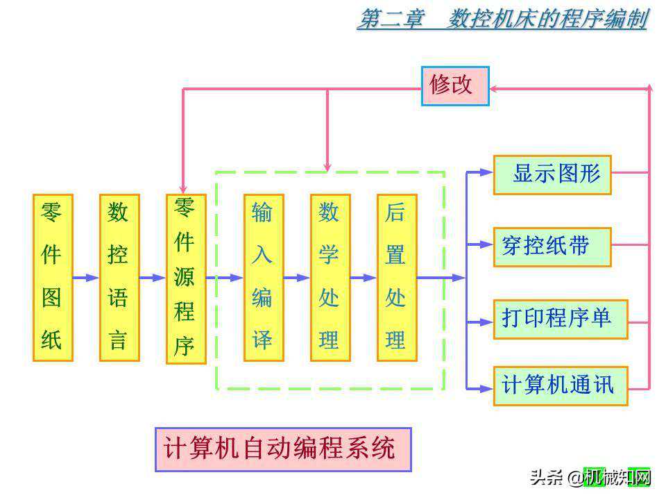 自动编程:编程人员只要根据零件图纸的要求,按照某个自动编程系统的规定,将零件的加工信息用较简便的方式送入计算机,由计算机自动进行程序的编制,编程系统能自动打印出程序单和制备控制介质。