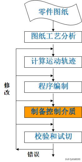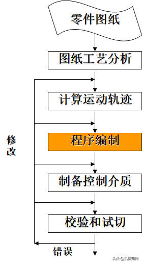 将零件的加工信息:加工顺序、零件轮廓轨迹尺寸、工艺参数(F、S、T)及辅助动作(变速、换刀、冷却液启停、工件夹紧松开等)等,用规定的文字、数字、符号组成的代码按一定的格式编写加工程序单,并将程序单的信息变成控制介质(磁带、磁盘、穿孔带)的整个过程。