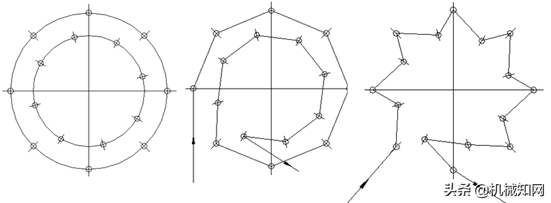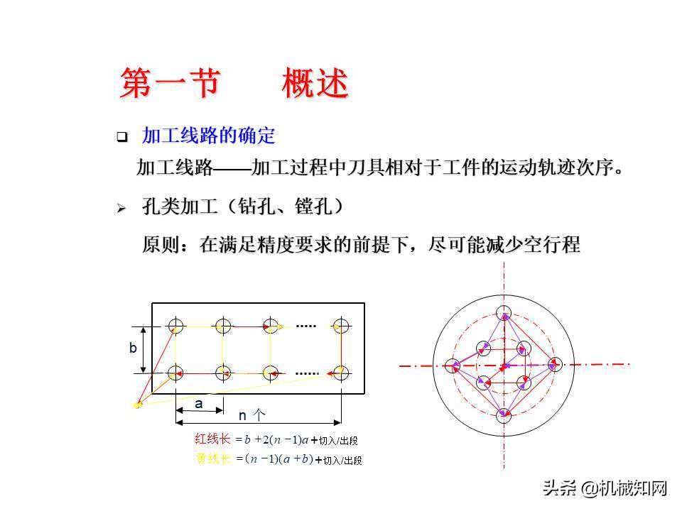 寻求最短加工路线如图a所示零件上的孔系,图b的走刀路线为先加工完外圈孔后再加工内圈孔。若改用c图的走刀路线,减少空刀时间,则可节省定位时间近一倍,提高了加工效率。